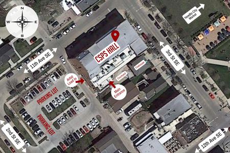 CSPS Hall is located at 1103 3rd St SE Cedar Rapids, IA 52401, directly across the street (southwest) from NewBo City Market. We encourage all visitors to use the Courtyard entrance that was added in 2011. This entrance can be reached from either Third Street, or from the alley that runs between Second and Third Street SE. It’s on the backside of CSPS Hall, and is adjacent to the CSPS Hall parking lot.